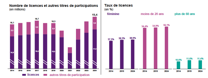 Premier moteur de cette économie : la pratique. En 2024, 19,4 millions de licences et titres de participation ont été recensés, un niveau inédit, en hausse de 6 % par rapport à 2019. Cette progression masque toutefois une transformation profonde des usages. La pratique encadrée continue de se développer, portée par le sport scolaire et les disciplines collectives, tandis que les compétitions événementielles et les pratiques libres gagnent du terrain.