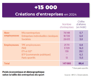 Côté marchand, la dynamique est spectaculaire. La France compte désormais 147 000 entreprises du sport, soit une hausse de 31 % depuis 2019. Derrière ce chiffre, deux réalités coexistent : un foisonnement de micro-entrepreneurs et un noyau de PME, ETI et grandes entreprises qui concentrent l’essentiel du chiffre d’affaires, estimé à 80 milliards d’euros en2024.